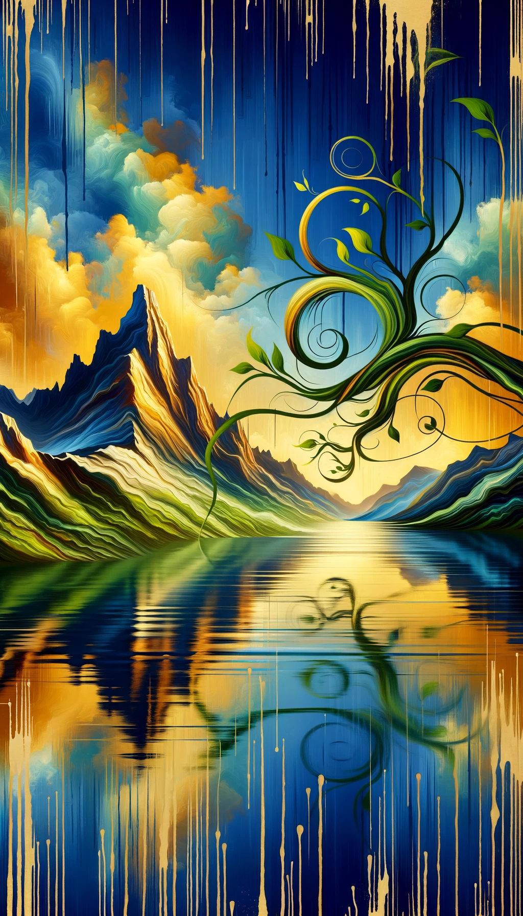 Breathe in the stillness of this artwork, where strength meets tranquillity. Witness the mountain's unwavering presence, reflecting your resilience, while the serene lake mirrors the calmness within you. The vibrant vine reaching towards the sky whispers of growth and rejuvenation, reminding you of your inner strength and endless potential.