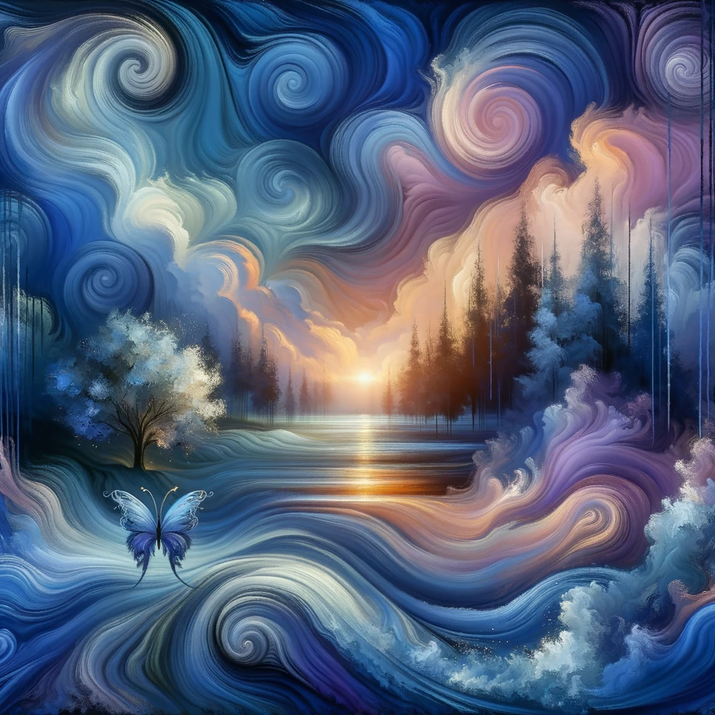 Embrace the swirling depths of soothing blue and purple, where the peaceful ocean meets the twilight sky. In this tranquil space, find solace in a forest bathed in gentle sunlight, symbolizing resilience and growth. Together, let us journey with the delicate butterfly, embodying transformation and hope in our shared healing process.