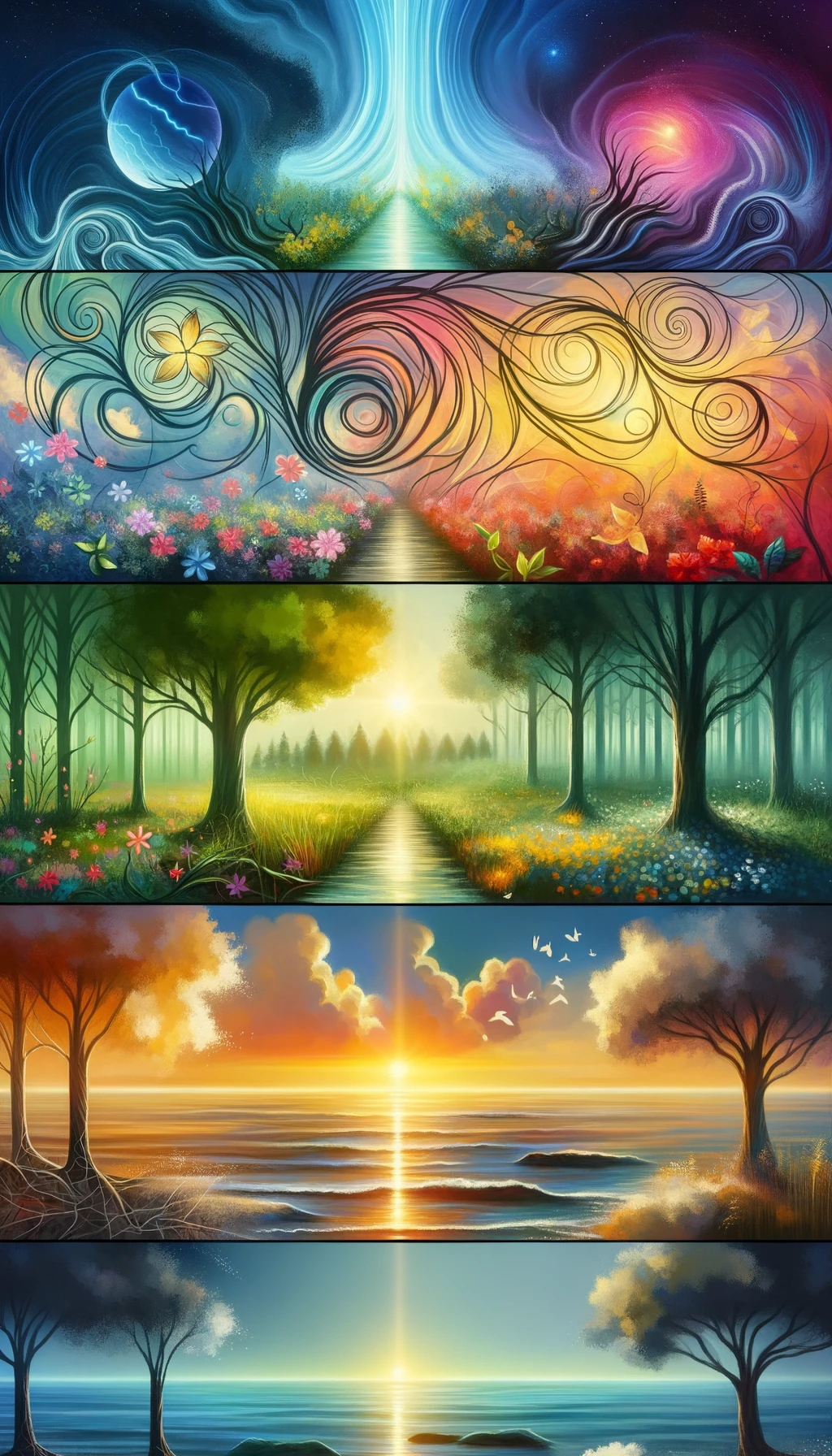 Embark on a journey of emotional growth, reflected in this digital painting. Experience the vibrant garden of blooming emotions, the tranquil forest of progress, and the serene seascape of inner peace. Each scene whispers of your courage and resilience, revealing the beautiful transformation within.