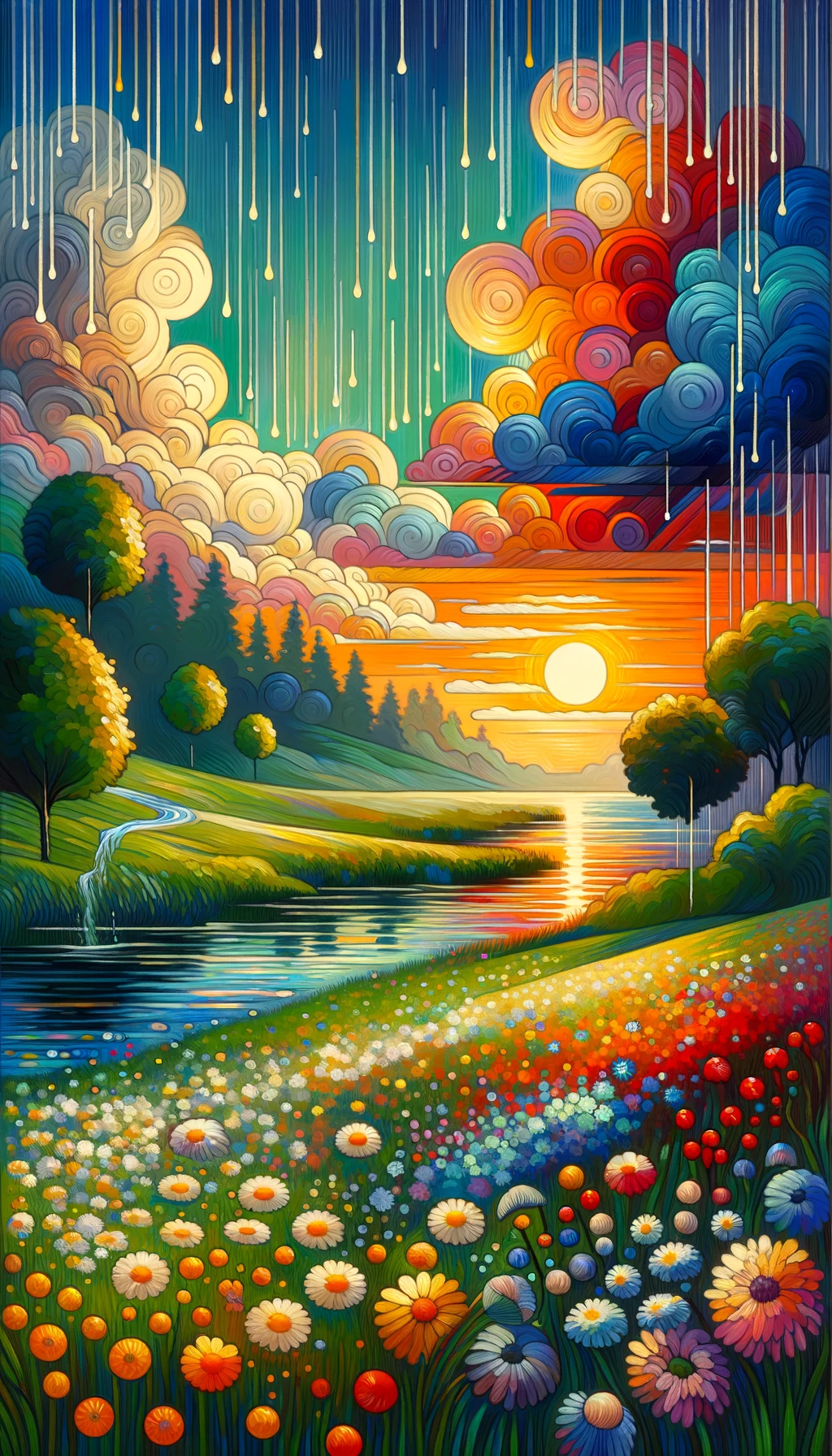 Serenity envelops the canvas as vibrant colors dance in harmony, mirroring the ebbs and flows of your courageous journey towards inner growth. The gentle rain soothes and nurtures, falling on blossoming wildflowers symbolizing your resilience amid life's challenges. Let the tranquil sunset and reflective lake guide you, while the winding river through the lush forest represents your path of transformation and self-discovery. πΏπΊπ